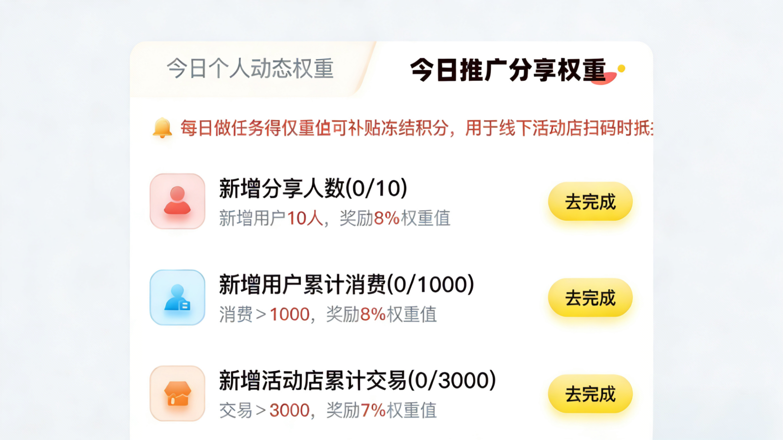 用户的每一份参与都能被认可:权重会随消费、互动等行为动态调整,每一笔消费、每一次互动都不白做,都会累积成权重。权重越高,解锁的平台福利越多——不管是消费折扣、专属权益,还是额外补贴,都能轻松拿到,让消费价值不止于“买东西”本身。