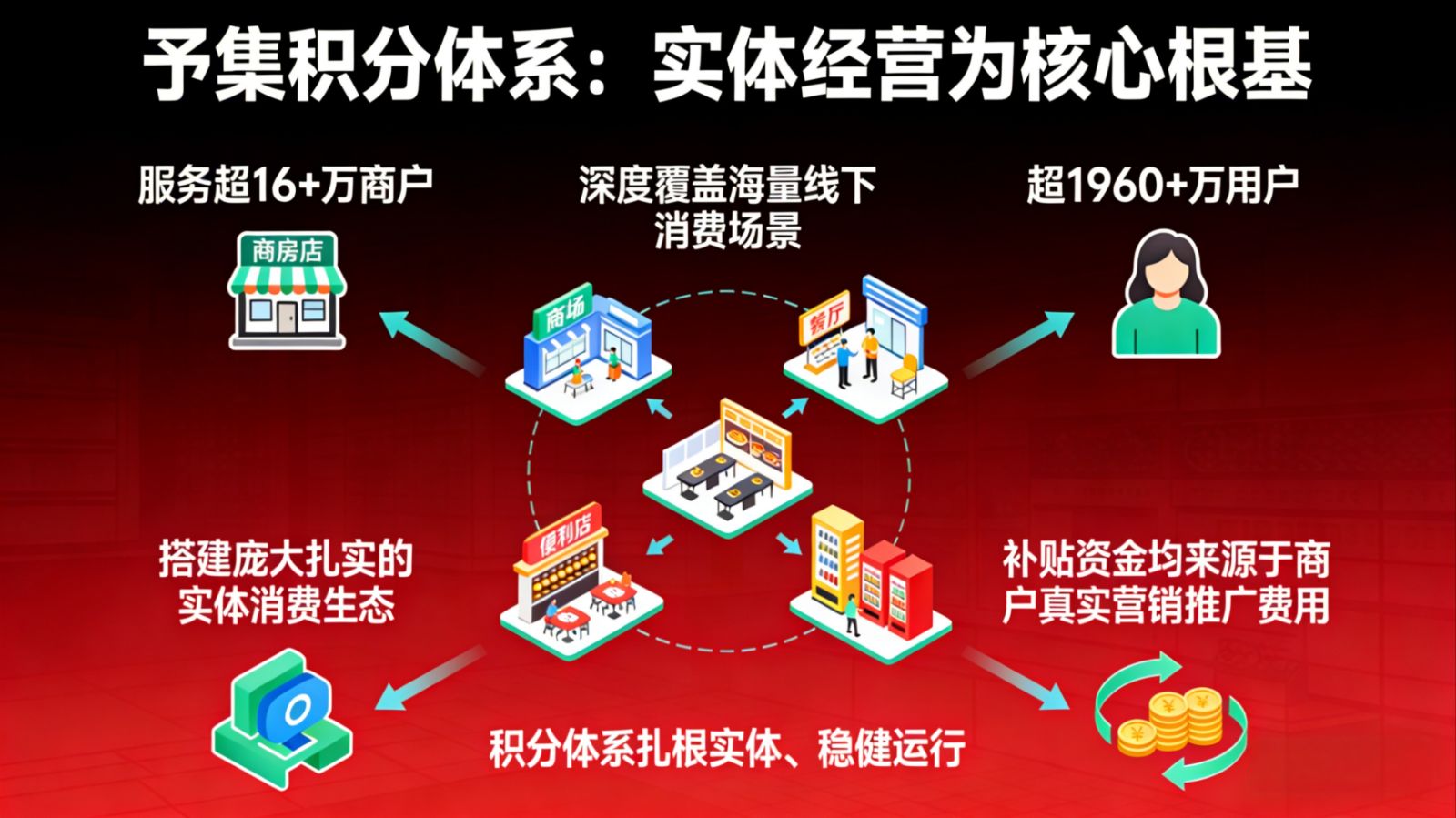 实体经营是予集积分体系的底气所在,更是平台所有模式能够落地的核心基础。目前予集已经服务16+万商户、超1960+万用户,深度覆盖海量线下消费场景,搭建起了庞大且扎实的实体消费生态。在补贴价值的保障上,平台始终坚持真实可溯,所有的补贴资金均来源于商户的真实营销推广费用,并非无依据的凭空许诺。这份实打实的资金来源,让每一笔补贴都有真实的价值支撑,也让整个积分体系脱离虚浮的泡沫,始终扎根实体、稳健运行。