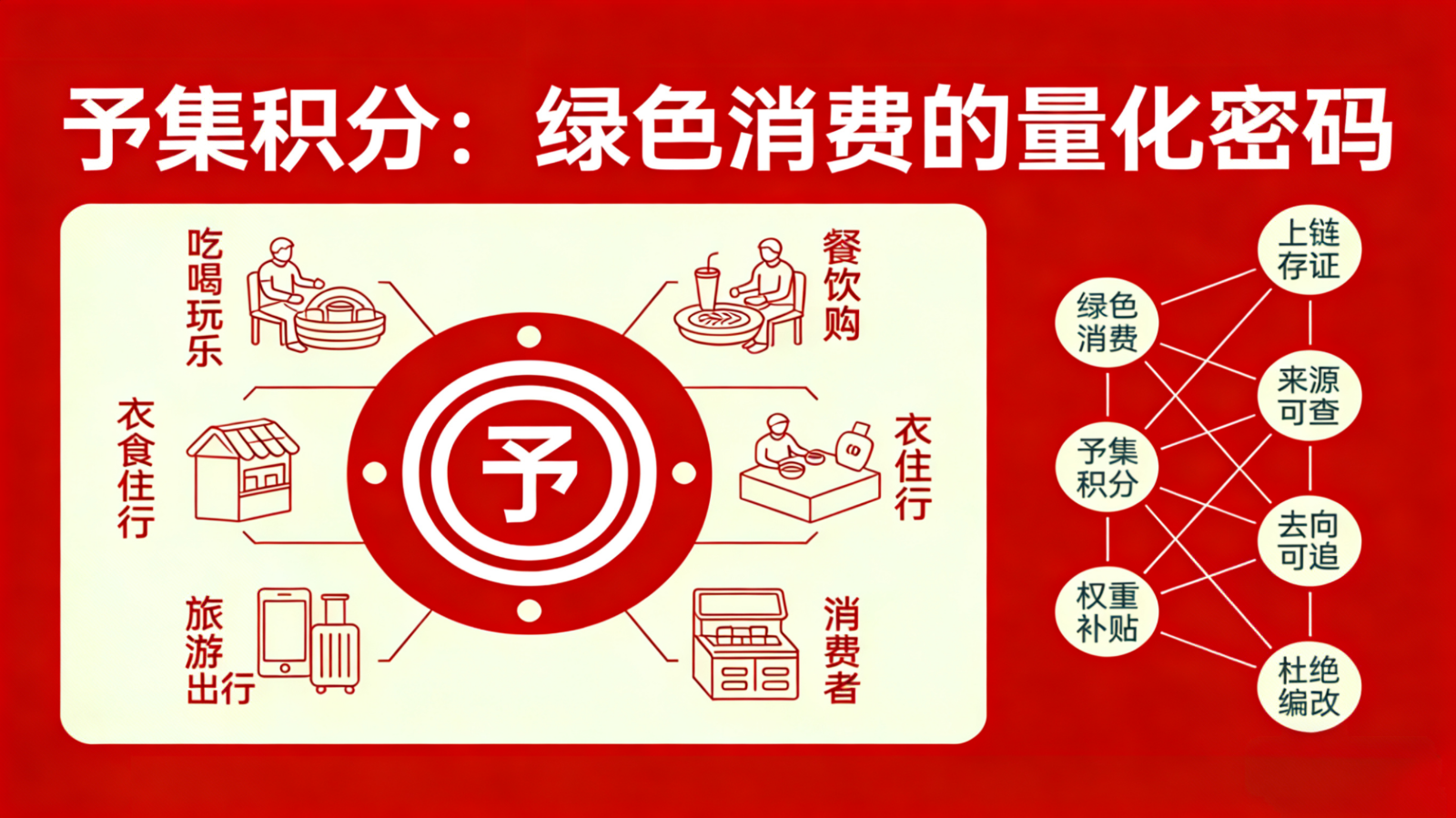 予集的核心定位,是以绿色消费为基础,用积分把大家的绿色行为真正量化落地。我们将予集积分与各类绿色消费场景深度对接,覆盖了日常生活里的吃喝玩乐、衣食住行,全品类消费场景,大家无需额外操作,只是进行日常的绿色消费,就能同步累积予集积分。在积分的管理上,我们依托区块链技术为积分实现全程上链存证,真正做到积分来源可查、去向可追,从技术层面彻底杜绝篡改的可能,让每一分积分都能精准对应每一次真实的绿色消费行为,让原本抽象的绿色行动,变成了看得见、可量化的具体成果,让绿色消费自然融入日常消费的每一个环节。